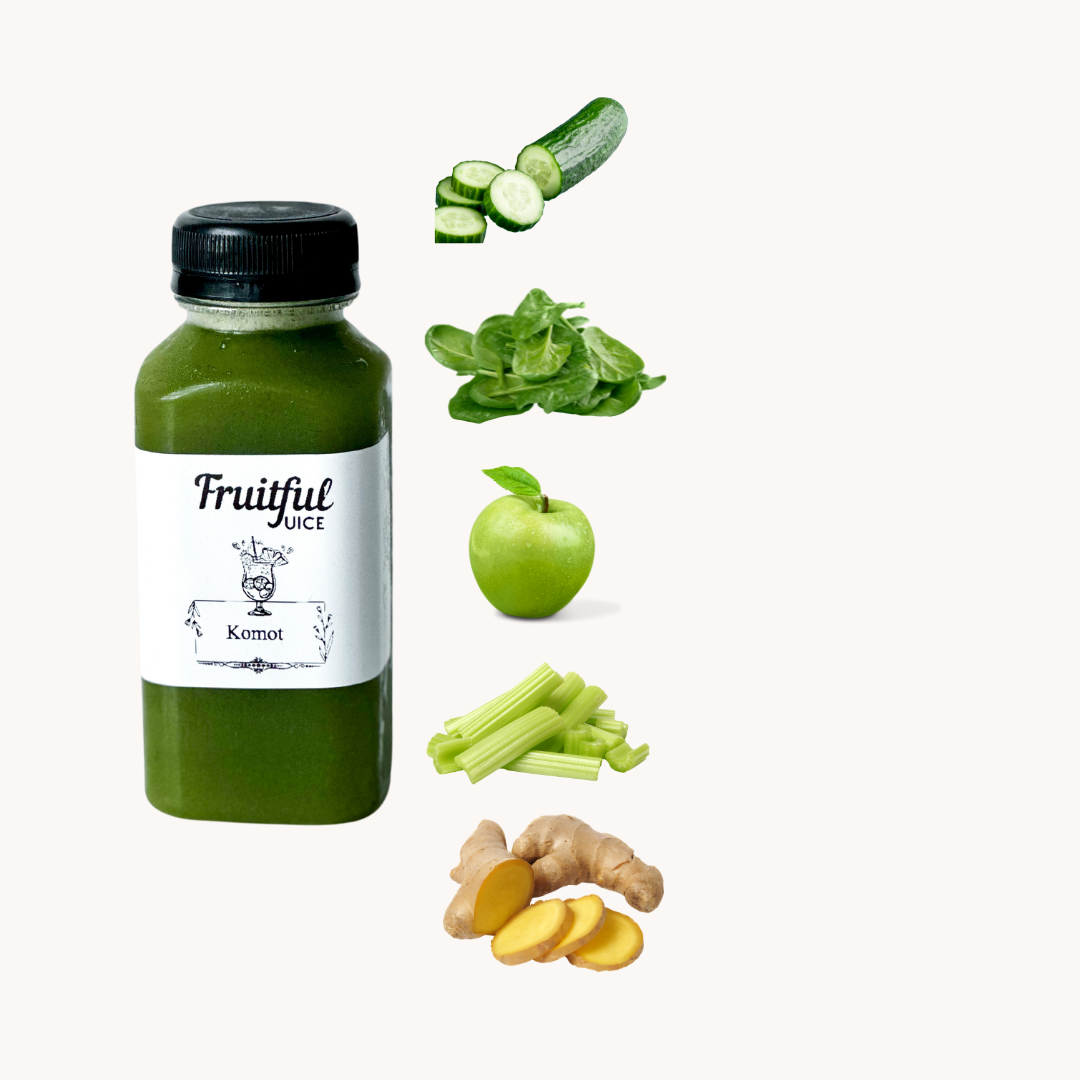 Detoxify your body with Komot, a refreshing juice blend made with 100% natural ingredients like apples, spinach, celery, ginger, and cucumber. This green juice is designed to support your body's natural detoxification process and is the perfect addition to your health and wellness routine